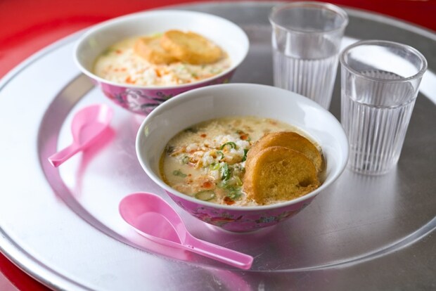 台湾の朝食メニュー「鹹豆漿(シェントウジャン)」は、温かい豆乳に酢や調味料を加えておぼろ状に仕立てたやさしい味わいのスープに、油条(台湾の細長い揚げパン)を浸して食べるもの。今回は、成城石井らしくお粥としてアレンジした。