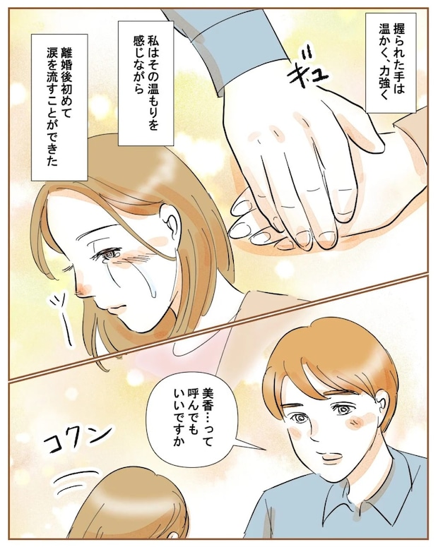 「え」と何を言っていいのか分からない私。すると「笠野さんにも聞きました」と切り出す佐藤さん。「『美香は離婚後、一度も泣いてない。きっと無理してる』って・・」麗子がそう言っていたと聞いて驚く私に、「僕じゃ頼りないかもしれないけど、もっと頼ってほしいです」佐藤さんにそう言われ、「佐藤さん・・」と呟いてしまいました。