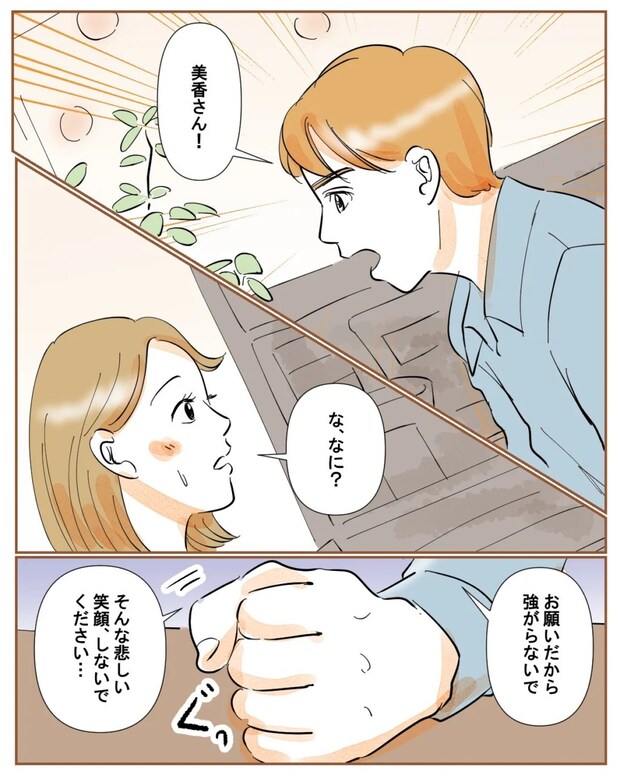 すると「美香さん!」と突然大きな声を出す佐藤さん。「な、なに?」何事かと思ってたずねると、「お願いだから強がらないで。そんな悲しい笑顔、しないでください・・」と私よりも悲しそうな表情で言いました。