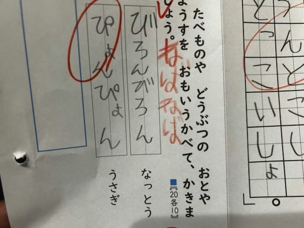 ブルーホップさんは、小1の息子さんが持って来た解答を見て爆笑したそう。息子さんが解答した納豆の擬態語に、思わず笑みがこぼれます。