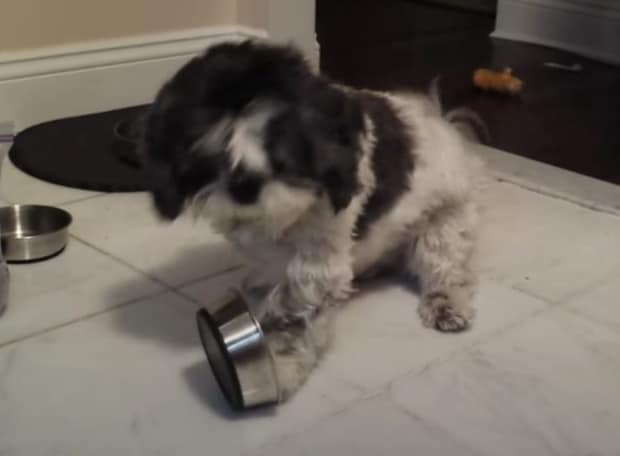 エサ皿を飼い主さんに見せて、
