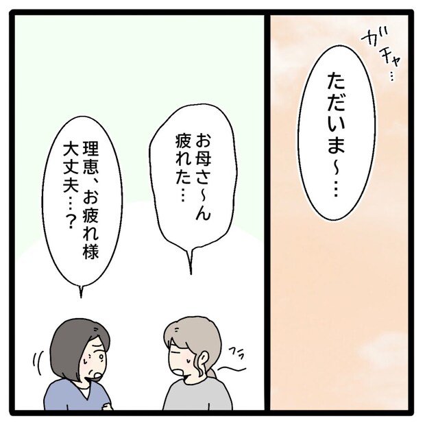 自分の身勝手さを棚に上げて私に刺々しい言葉を投げかけてくる正志には終始腹が立ちましたが、話し合いは何とか終了。実家に行くと、張り詰めていた緊張が解けどっと疲れが押し寄せてきました。「お母さ~ん疲れた・・」とフラフラの状態で部屋に入ると、「理恵、お疲れ様。大丈夫・・?」と心配そうにお母さんが聞いてきました。