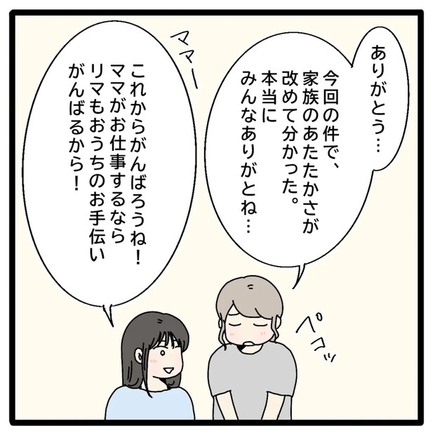 「ありがとう・・。今回の件で、家族のあたたかさが改めて分かった。本当にみんなありがとね・・」私が改めてみんなに感謝を伝えると、「ママー、これからがんばろうね!ママがお仕事するならリマもおうちのお手伝いがんばるから!」とリマが言ってくれました。