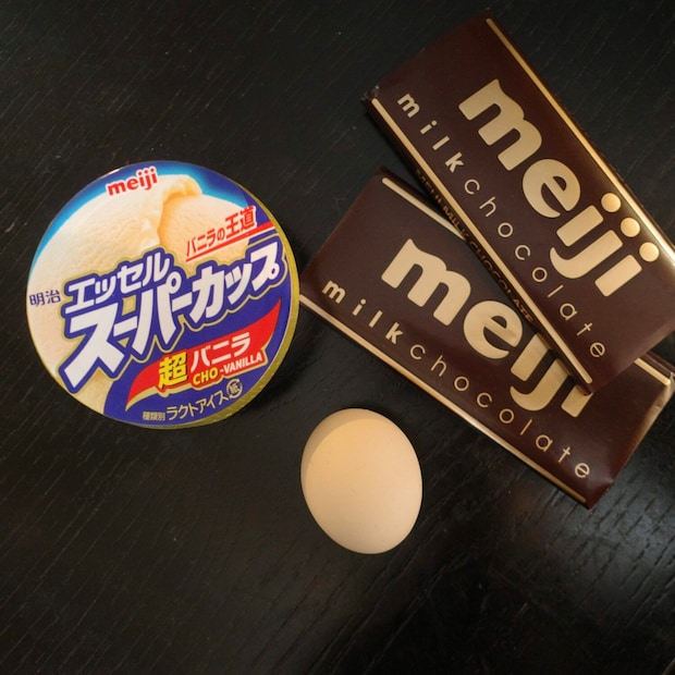 ①チョコ2枚を細かく割り、バニラアイス半分よりすこし多めを混ぜて