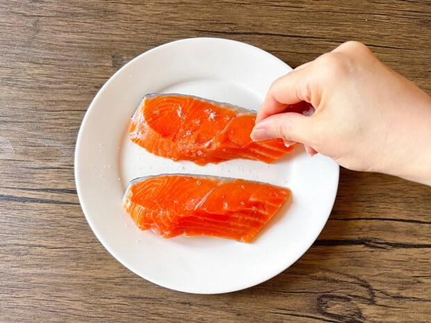 鮭を焼く前に塩を振って15分ほどおき、水気を拭き取ります。塩を振っておくと余分な水分が抜けて身が引き締まり、水分を保持しやすくなりますよ。身の崩れやすさも防げます。
