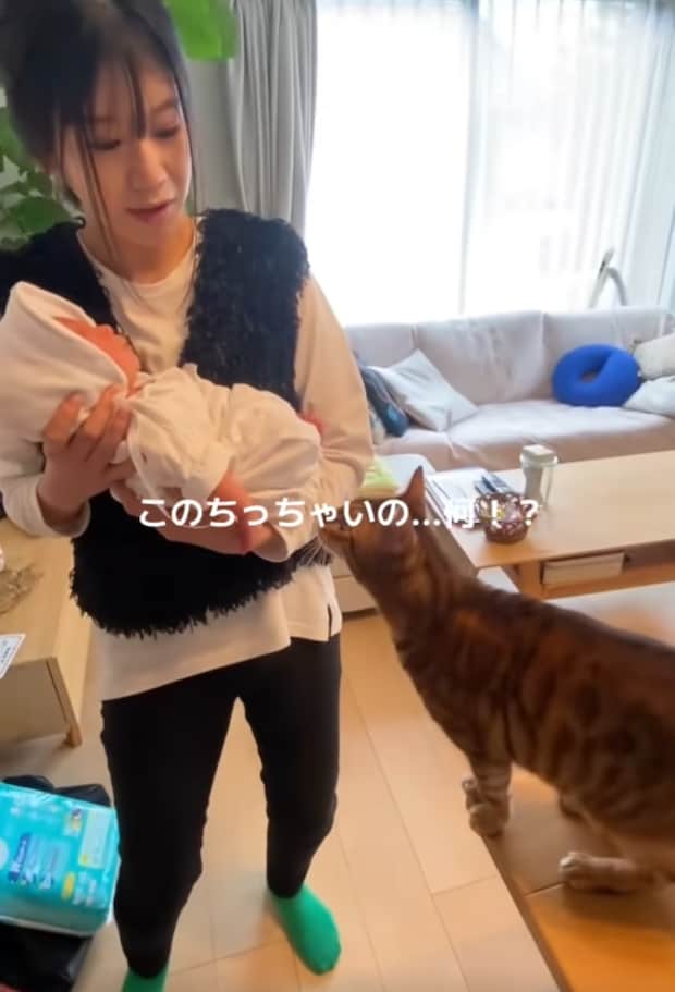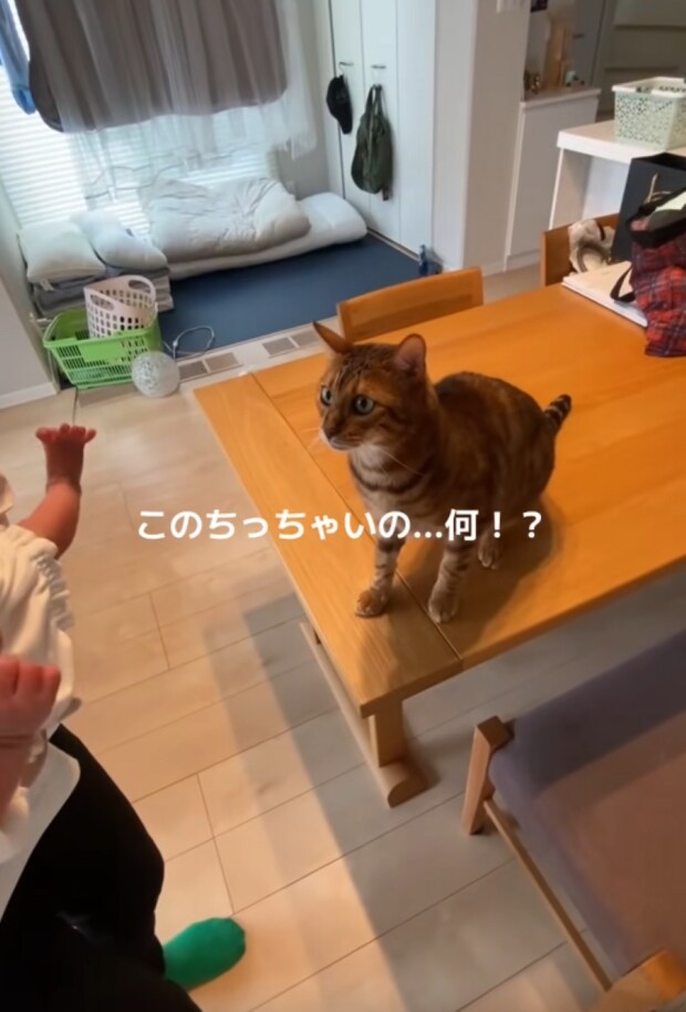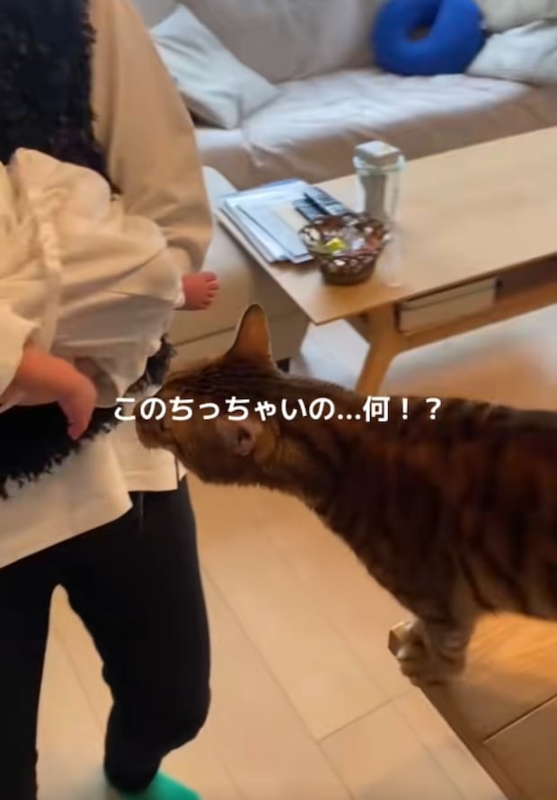 赤ちゃんを初めて見た猫ちゃん。猫ちゃんが「どうしたらいいの……⁉」と言いたげな困惑顔になっています(笑)。