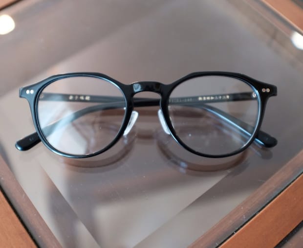 「太すぎないフレームなので、ほどよい存在感のため重く見えない黒縁メガネ。丸みのあるボストンよりのシルエットが気に入っています」金子眼鏡のアイウェアは本人私物