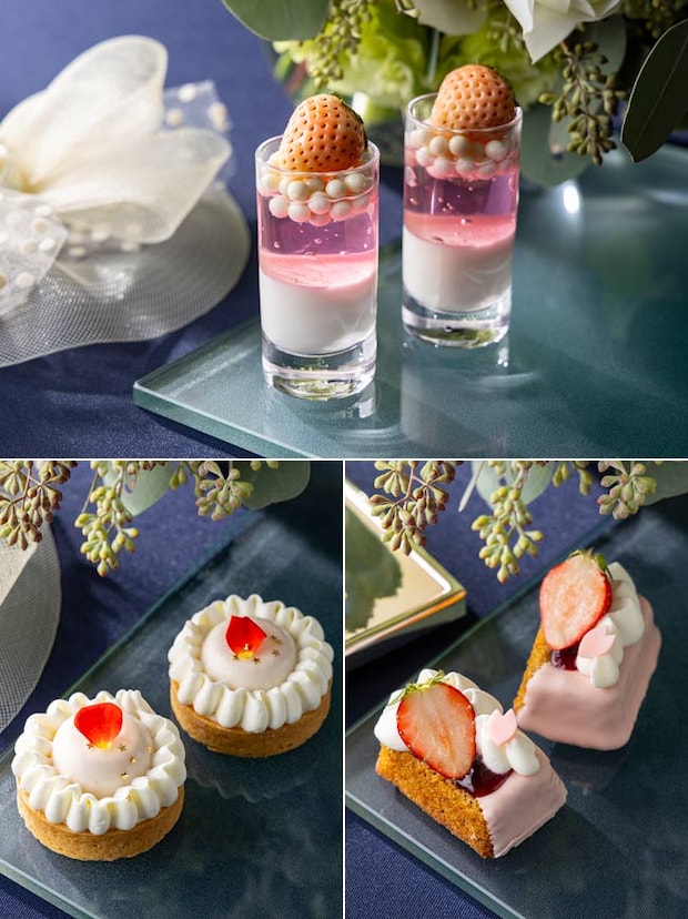 「桜のヴェリーヌ」は、ココナッツゼリーの上に桜ゼリーを重ね、パールと白いちごで仕上げた春色満載のグラススイーツ。いちごの甘酸っぱさ、桜の香り、ココナッツの優しい甘みが奏でるハーモニーを堪能して。