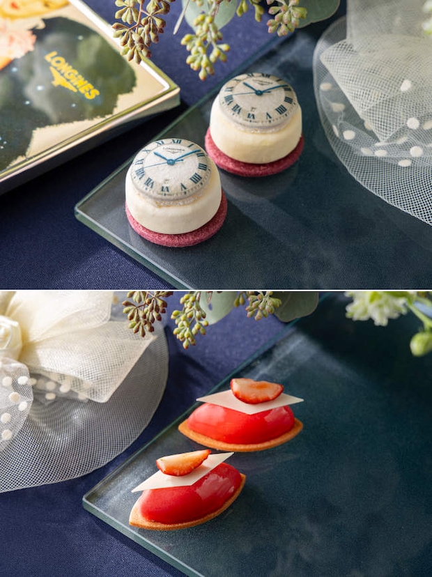 「いちごとラズベリーのムース」は、口どけなめらかないちごのムースでラズベリーのジュレを包み、いちごサブレを合わせたベリー尽くしのスイーツ。しなやかなシルエットで、洗練された時計の針が表現されている。