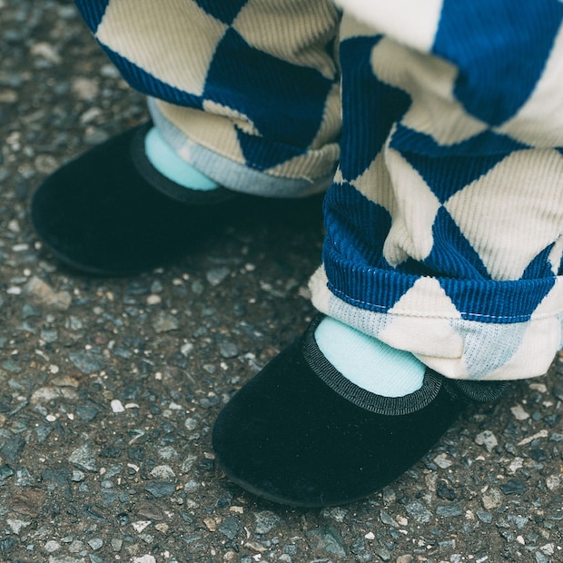 『シエンタ』のブラックシューズからライトブルーのソックスがちらり。コーデュロイのボトムスがあたたかみを添え、抜かりない足元コーデ。