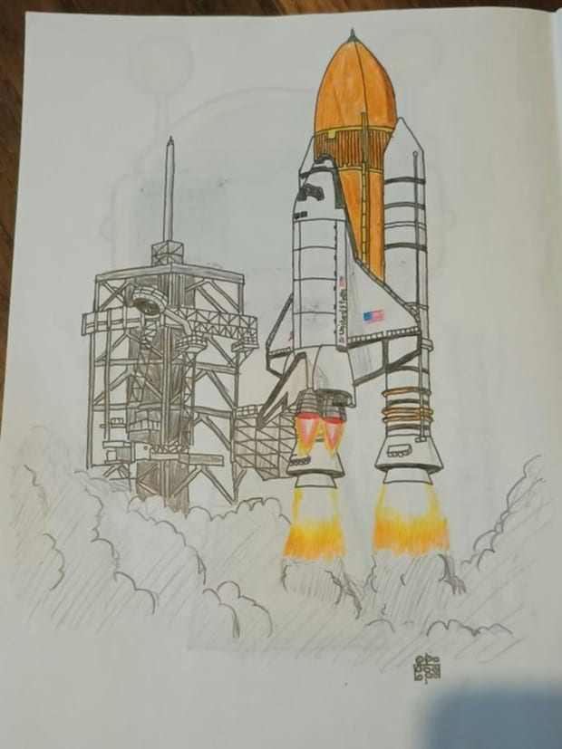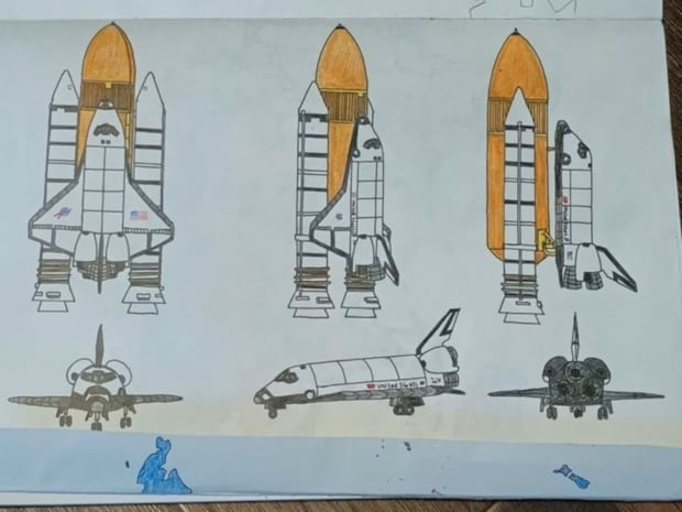 紙いっぱいに描かれていたのは、大きなロケットや飛行機。息子さんはきっと宇宙やロケット、飛行機など空を飛んでいくものが好きなご様子。これはもうただの落書きレベルではなく、ひとつの作品として完成していますよね。