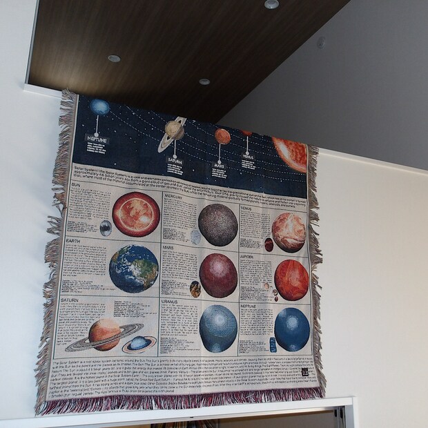 まずはbpr BEAMSで購入した宇宙柄のスローケット。星や惑星のイラストが可愛くて一目惚れしました。子供達もすぐに反応し、『これはなーに?』と会話が生まれるのも嬉しいポイントです!ソファーに掛けようと思っていましたが、まずは眺めたいなぁと思い、壁に掛けて絵画のような感覚で飾ってます∩^ω^∩
