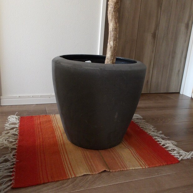 土や水の汚れ防止はもちろんのこと、鉢と床の間に一枚あるだけで、空間が少し落ち着いた印象になります。小さなラグですが、あるのとないとでは大違いなのです∩^ω^∩