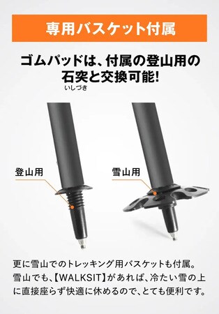 「WALKSIT」は、普段はスタイリッシュなウォーキングステッキだが、必要な時だけ“1秒でチェアに変身”する“ハイブリッド型スタンディングチェア”。ステッキのグリップ部分をカチッとひねると座面に変身し、旅行、登山、キャンプ、フェス、スポーツ観戦、花火大会など、さまざまなシーンで“座る自由”を提供する。