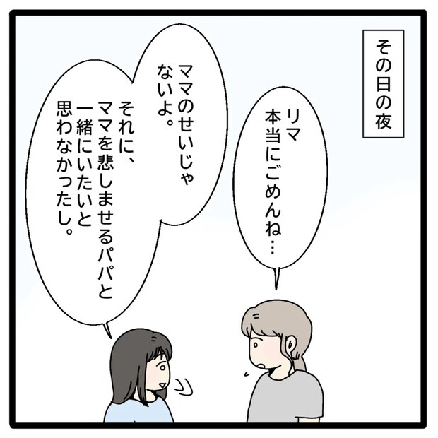 その日の夜。私たち夫婦の問題にリマを巻き込んでしまったことが申し訳なくて「リマ、本当にごめんね・・」と改めて謝りました。でも、リマは「ママのせいじゃないよ。それに、ママを悲しませるパパと一緒にいたいと思わなかったし」と言ってくれました。本当は寂しい気持ちもあるはずですが、私を気遣ってくれるリマの言葉に救われました。