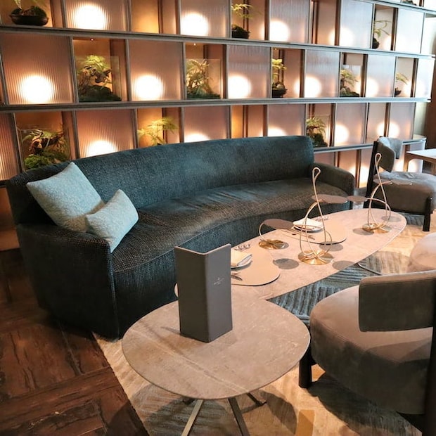 編集部が訪れたのは、大きな窓から光が注ぐバーカウンター横の「J Wバー」のエリア。ゆったりとしたソファに座ると、周りには盆栽が。和と洋が見事に調和しており、洗練された時間の始まりを予感させます。