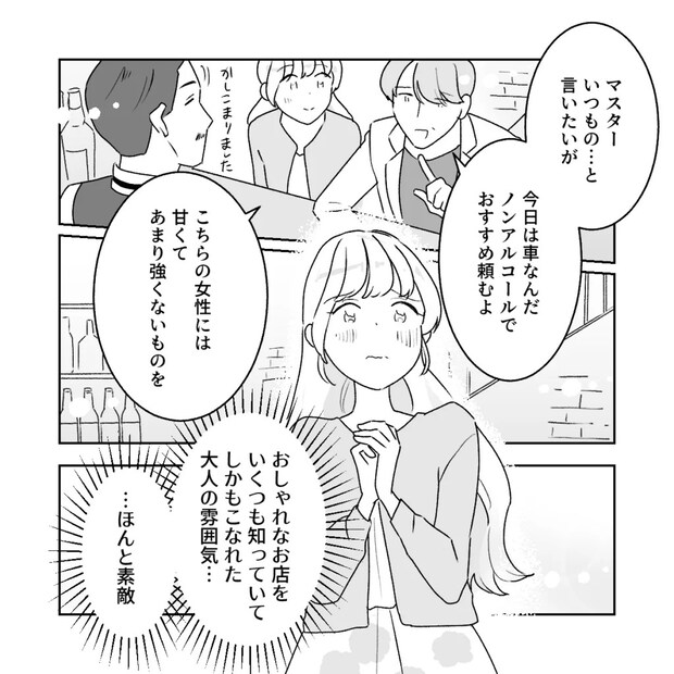 この日は素敵なバーに連れていってもらいました。「マスター、いつもの・・と言いたいが、今日は車なんだ。ノンアルコールでおすすめ頼むよ。こちらの女性には甘くてあまり強くないものを」と慣れた様子で注文する和男さん。やっぱりかっこいい!和男さんはおしゃれなお店をいくつも知っていて、いつも違うところへ連れて行ってくれます。しかも、こなれた大人の雰囲気・・本当に素敵すぎます。