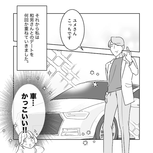 幼稚園教諭として働いている23歳のユメさん。結婚願望はあるものの出会いがなく嘆いていると、同僚で友人のアキさんからマッチングアプリで彼氏ができたと聞き、恐る恐るマッチングアプリを始めます。ガツガツした男性が苦手なユメさんの目に留まったのは、落ち着いた雰囲気の和男さん。プロフィールを見ると和男さんは51歳。28歳の年齢差に一瞬ためらったものの、ユメさんは和男さんとメッセージのやり取りを始めてみました。落ち着いて紳士的な文面に好感を持ったユメさんは、やり取りをするうちに和男さんに惹かれていきました。待ちに待った初デートの日、スーツをビシッと着こなした素敵な和男さんの姿にときめくユメさん。和男さんは素敵なレストランを予約してくれていたり、さり気ないエスコートや気配りをしてくれたり、いつの間にかお会計を済ませてくれていたりと大人の魅力満載でユメさんはうっとり。さらに、大人の余裕がありガツガツしていない和男さんの様子に「なんて紳士的なの」と惚れ惚れし、「私の王子様、見つけたかも!」と運命の出会いを感じます。そして、2回目のデートで「私とお付き合いいただけませんか。年齢差はありますが、真剣です」と交際を申し込まれ、運命を確信したユメさんは和男さんと交際することに。報告を受けたアキさんは、和男さんにメロメロな様子のユメさんを心配しますが、ユメさんは「大丈夫だって!」と自信満々。