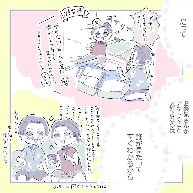 同じ目線に立って考えてくれているアキトさんの気持ちに対して、heraco.さんはうれしく思います。そして、アキトさんのお兄さんが、アキトさんのことを大好きなのは、一目瞭然なようですね。