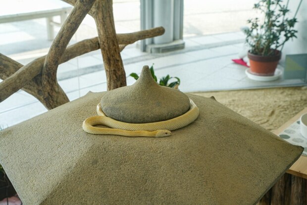 飼育施設は、白蛇資料館(室内飼育施設)と屋外飼育施設があり、室内では4匹、屋外では約40匹ものシロヘビが飼育されています!