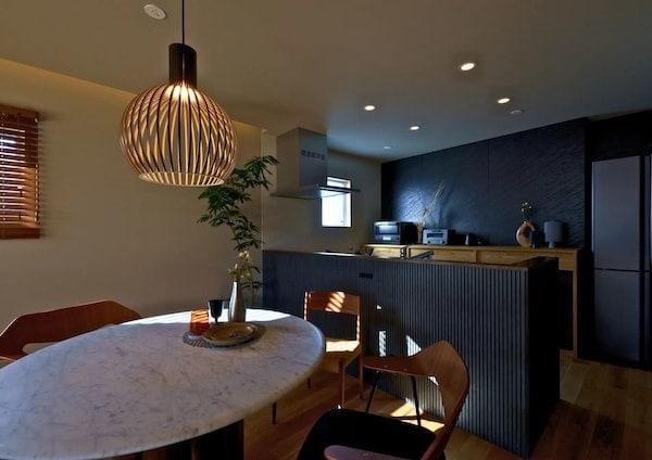 床材には無垢のナラ材を採用し、造作の建具や収納、キッチンなどを随所に取り入れることで、木のぬくもりと空間全体の一体感を大切にしている。時を重ねるほどに味わいを増す自然素材が、住まいに上質さとやさしいたたずまいをもたらすだろう。