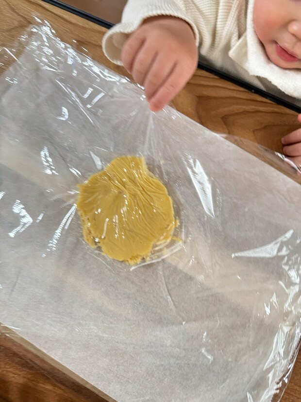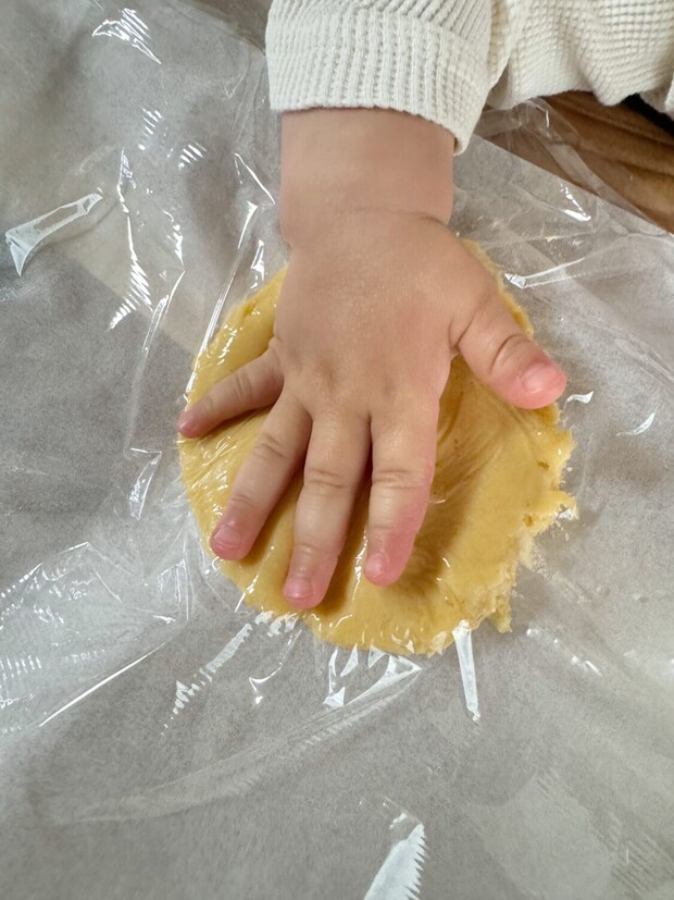 感触が面白いのか何度も触っていました笑 6. ラップをかけた生地にぎゅ〜っと手形をつけていきます♪