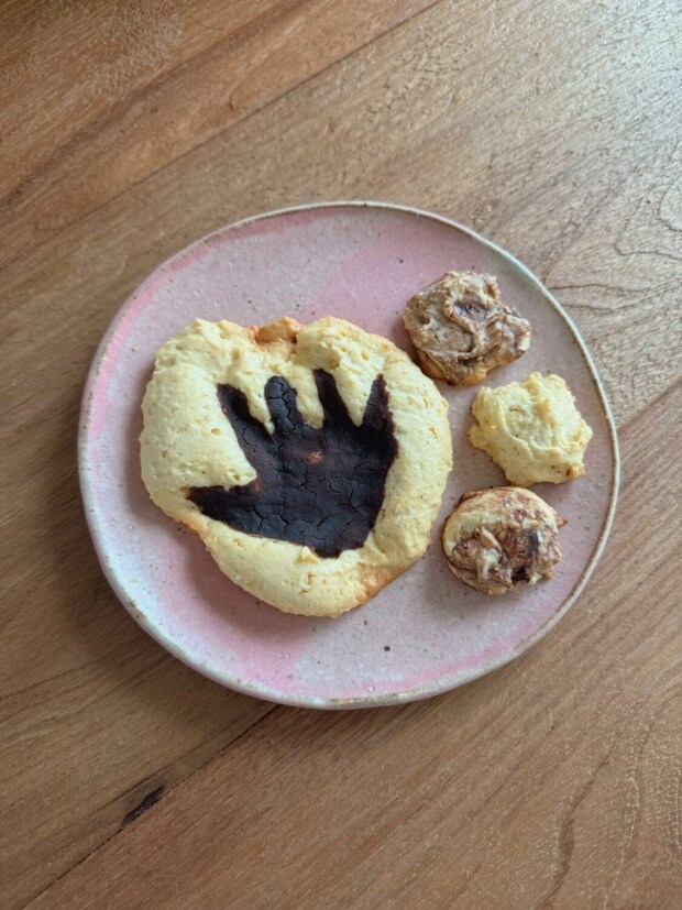 作る工程で指先の感覚も楽しいクッキー作り。仕上がりを見た息子は自分の手を手形に合わせたりして嬉しそうにしていました♪完成したクッキーはパパへプレゼント♪( ´▽`)