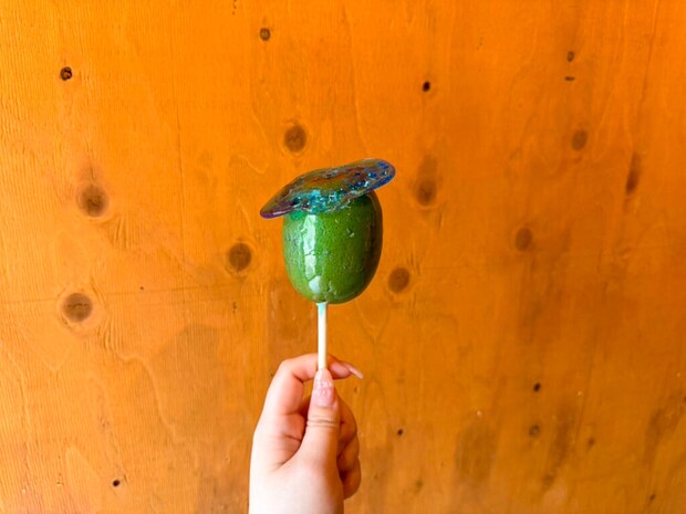 鮮やかなグリーンの果実をまるっと包んだ、ツヤっと美しい飴細工は見た目からインパクト抜群!