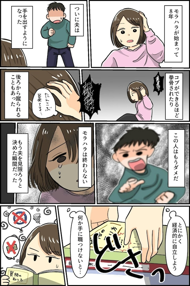 モラハラが始まってから8年…。ついに夫から暴力をふるわれるように。暴力に耐えかね、主人公は夫から「もう離れよう」と決意します。そして、自立するため、資格を取得して職を手にします。