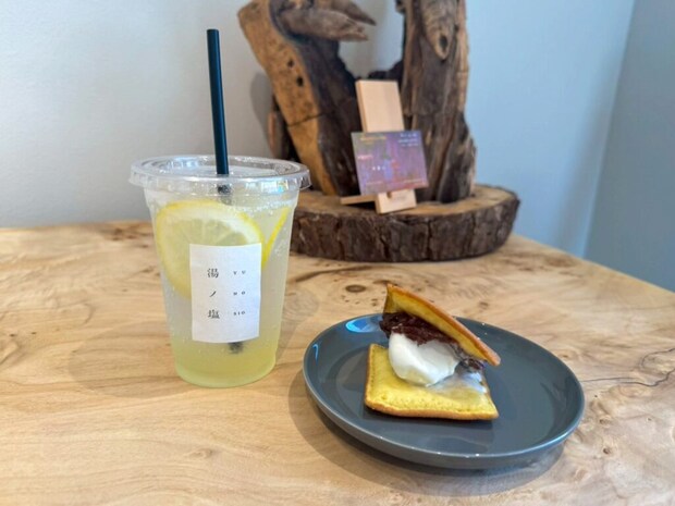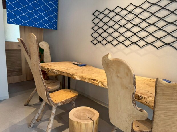湯ノ塩さんでは、鳥取の樹齢300年以上の木材や地元アーティスト制作の椅子など、温もりを感じる店内づくりにもこだわりが。