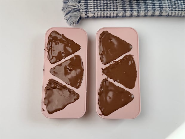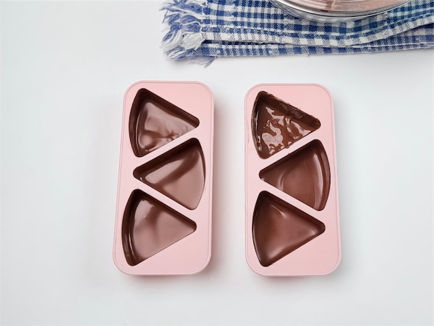 2. 溶かしたチョコレートを型に塗り、冷蔵庫で5分ほど冷やす。