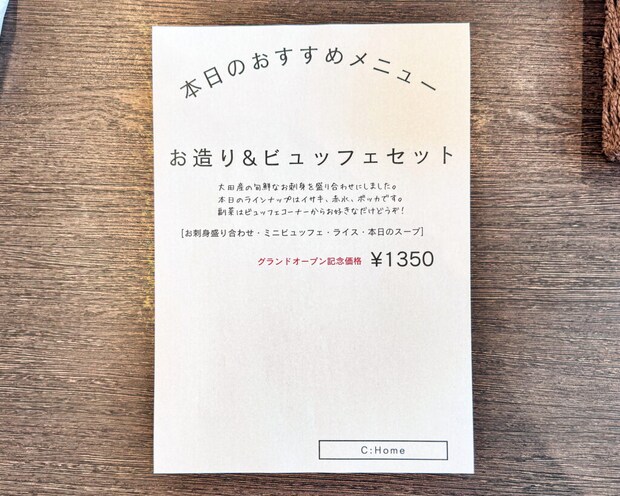 本日のおすすめメニュー「お造り&ビュッフェセット」は、お刺身の盛り合わせに汁物、ご飯、そしてビュッフェがついてグランドオープン価格の1,350円!