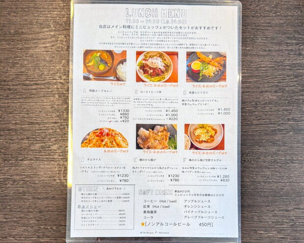 ランチメニューは単品かビュッフェ付のどちらか選べ、ビュッフェ付きにすると、手作りのお総菜やサラダが食べ放題。