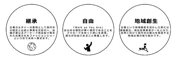 あらゆる個性が輝き、全ての人が自由に歩んでいける街を目指し、古着カルチャーの継承と、商店街の歴史を次世代へ繋ぐ地域の取り組みを融合させ、多様な人々が共に未来へ歩める街として展開する。