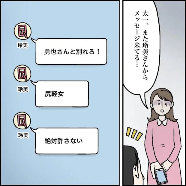 玲美さんに勇也さんと不倫していると言われ、義実家で食事会どころではなくなった私たち。帰り道、どういうことなのかと太一と話すも、勇也さんとは結婚式で一度会っただけ、しかも単身赴任中だし、私は毎日仕事していて物理的にも無理。全く思い当たらず考え込んでいると、「しばらくほっとけばおさまるさろ」と太一。でも、そんなはずはなく、玲美さんの行動は一層エスカレートしたのでした。