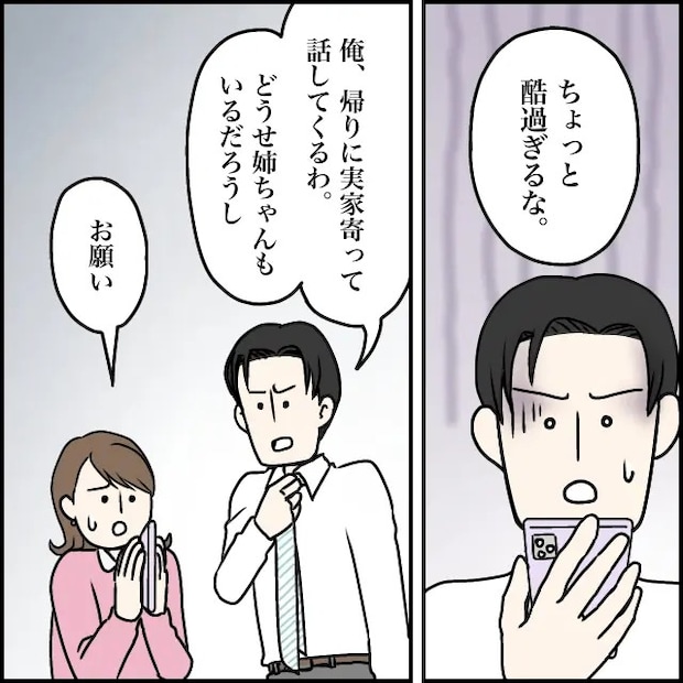 それを見た太一は、「ちょっと酷過ぎるな」と青ざめた顔で言い、「俺、帰りに実家寄って話してくるわ。どうせ姉ちゃんもいるだろうし」と言い、私は「お願い」と手を合わせて頼みました。