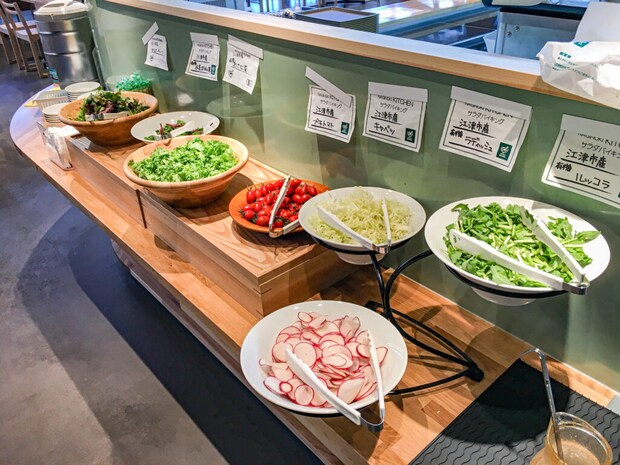 定食メニューなどの単品を除いた食事には有機野菜のサラダバーがセットになっています!