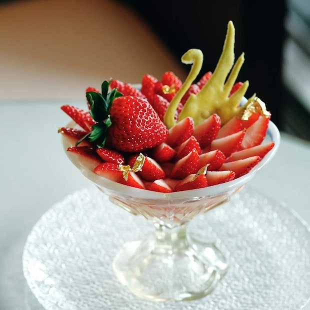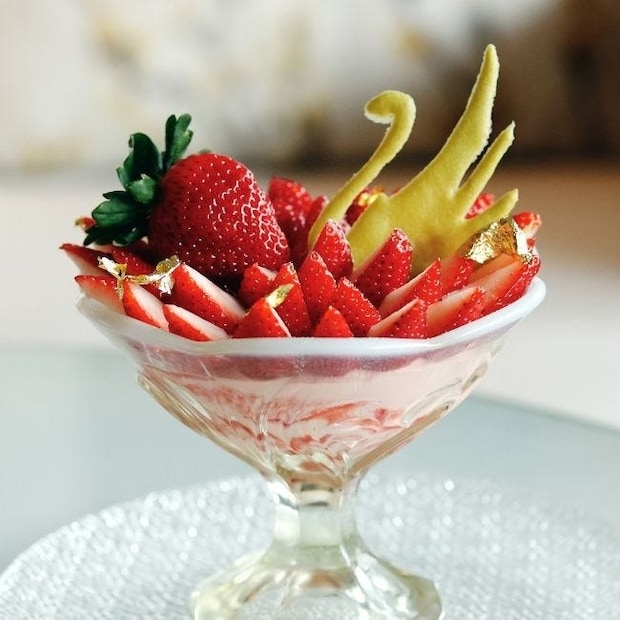 食べるのがもったいなくなるような美しいいちごパフェ。しっかり写真に収めたら、フレッシュないちごとシェフの技が溶け合う逸品を、思う存分ほおばって。