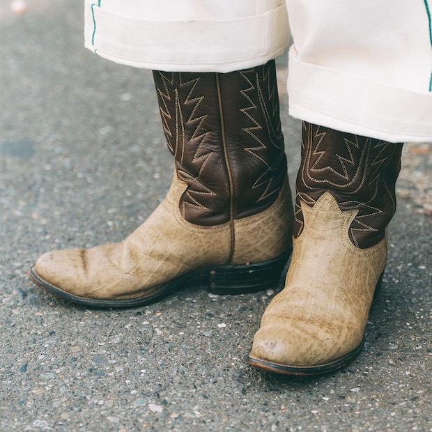 まだまだトレンドのウェスタンブーツはヴィンテージのもの。ベージュ×ブラウンのツートンが味わい深い。