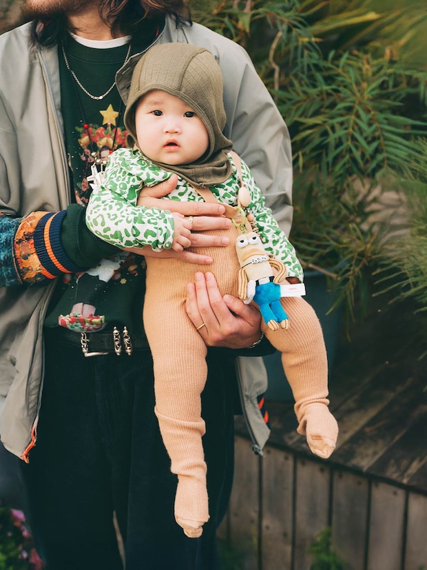 『モロ』のアニマル柄ロンパースは、よく見るとさまざまな動物が隠れたユニークな一着。これ感あるカーキのバラクラバで、ママパパとの空気感をシェア!
