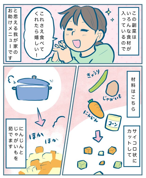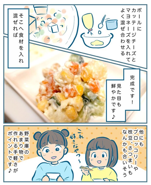 『育児』×『料理』をテーマに、野菜嫌いな長女ちゃんが奇跡的に食べたメニューや、子どもと一緒につくった料理など、チッチママさんのおいしくて愛情たっぷりの食にまつわるストーリーを連載します。思わず食べたくなるおいしそうな料理のイラストにも注目。第57回目は、学校の給食メニューを再現した副菜のお話。カッテージチーズを混ぜればおしゃれ度もアップ! ぜひ参考にしてね。