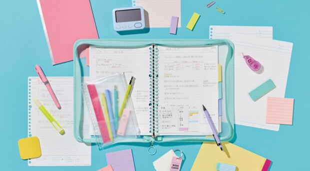 バインダー表紙の周囲を閉じられる「ぐるっとジッパー」採用により、ルーズリーフやプリントはもちろん、文具や小物、ガジェット類までをひとまとめに収納できます。
