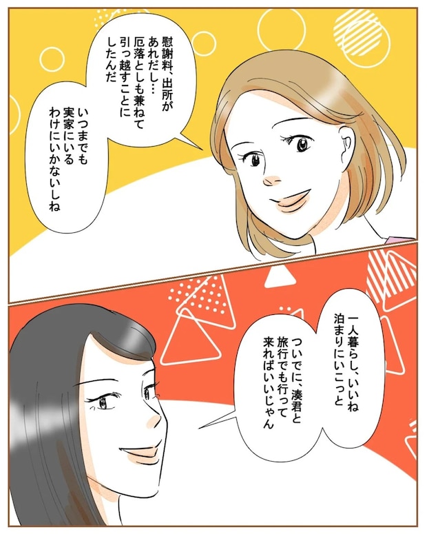 「慰謝料、出所があれだし・・厄落としも兼ねて引っ越すことにしたんだ。いつまでも実家にいるわけにいかないしね」と話すと、「一人暮らし、いいね。泊まりに行こっと。ついでに、湊君と旅行でも行って来ればいいじゃん」と麗子も自分のことのように楽しそうに言いました。