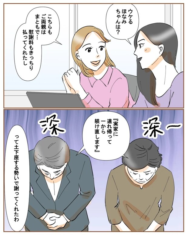 麗子も面白がって「ウケる。ほなみちゃんは?」と興味津々。「こちらもご両親はまともで・・。慰謝料もきっちり払ってくれたし。『実家に連れ帰って一から躾け直します』って土下座する勢いで謝ってくれたわ」と二人揃って深々と頭を下げるほなみちゃんのご両親の姿を思い返した私はちょっと同情してしまいました。