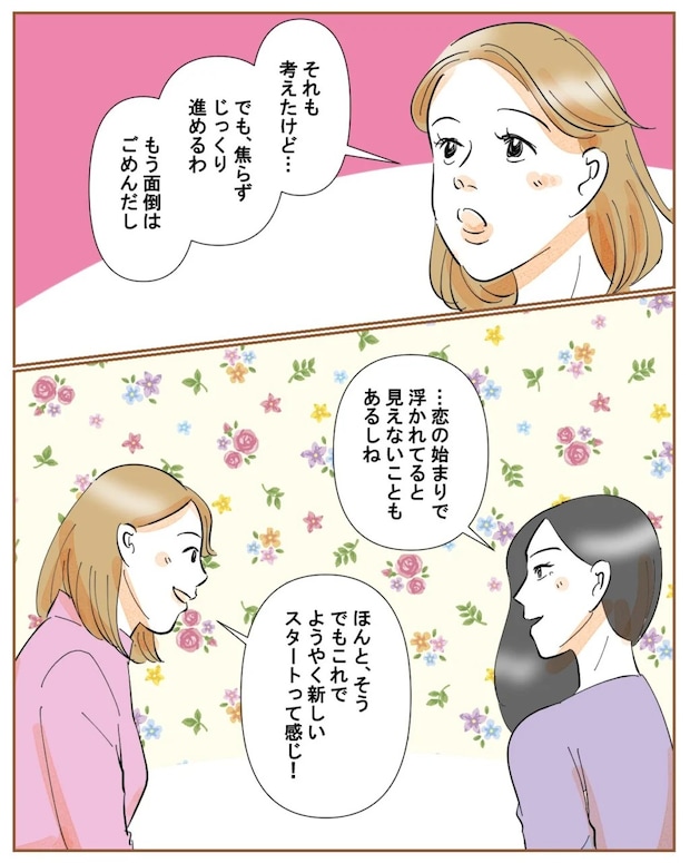 実は、私も引っ越しを決めたときに湊との同棲を考えなかったわけではありません。「それも考えたけど・・。でも、焦らずじっくり進めるわ。もう面倒はごめんだし」と考え直したことを話すと、「・・恋の始まりで浮かれてると見えないこともあるしね」と麗子も共感してくれました。和也が女性にだらしないことを結婚前に見抜けなかった私にはちょっと耳が痛いです。「ほんと、そう。でもこれでようやく新しいスタートって感じ!」和也に浮気され、離婚して、ようやく気持ちが落ち着いてきたと思ったら和也に復縁を迫られたり、ほなみちゃんから逆恨みされたり・・いろいろと大変だったけれど、これで本当にスッキリして前に進めそうです。そして、新しいスタートを切る私の隣には湊がいてくれる。これからも思いもよらぬことが起こるかもしれないけれど、湊と2人で乗り越えていけたらいいなと思います。