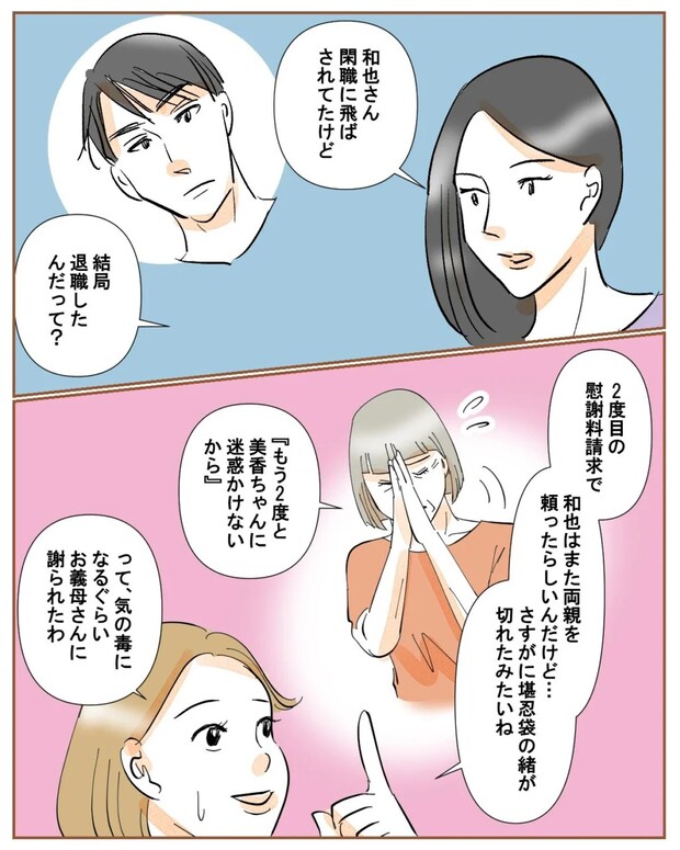 私と湊の交際を喜んでくれた麗子は、思い出したように「和也さん、閑職に飛ばされてたけど、結局退職したんだって?」と聞いてきました。ほなみちゃんとの不倫が社内で噂になり閑職に飛ばされていた和也は、居づらくなったのか退職したそうです。「2度目の慰謝料請求で和也はまた両親を頼ったらしいんだけど・・さすがに堪忍袋の緒が切れたみたいね。『もう2度と美香ちゃんに迷惑かけないから』って、気の毒になるくらいお義母さんに謝られたわ」と麗子に話しながら、改めて和也と離婚できてよかったなとしみじみ思いました。