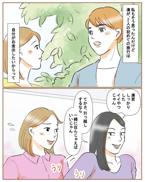 私も湊との旅行は考えたのですが、2人の初めての旅行は自分がお金を出したいと湊が言ったので、その気持ちが嬉しくて・・。旅行はしばらくお預けですが、楽しみが増えたと思っています。そのことを麗子に話すと「湊君、しっかりしたイイやつじゃん。てかさ、引っ越しするなら一緒に住んじゃえばいいじゃん」と肘で私をつつきながらニヤニヤ。
