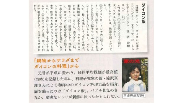「ダイコン飯」の元レシピは平成元年2月号に掲載されていました。料理研究家の故・滝沢真理さんのレシピです。