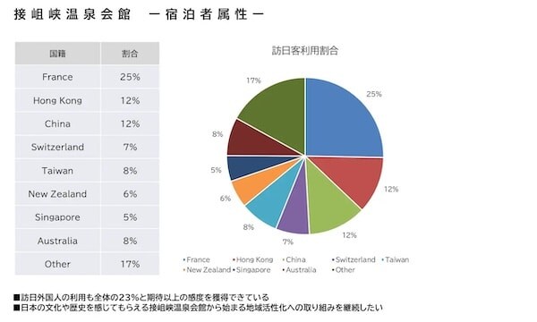宿泊と近隣観光を組み合わせた利用が増え、地域全体の回遊性も向上している。訪日客の23%という高い利用率も追い風となり、「接岨峡温泉会館」は日本文化や歴史を感じられる拠点として、地域活性化を牽引する存在へと進化しているという。