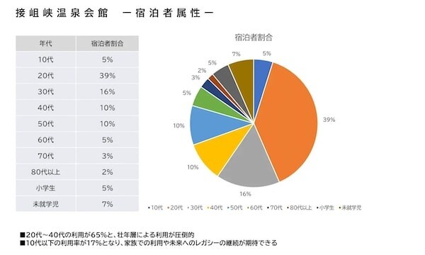 また、利用者の65%が20〜40代で、若い世代の旅の目的地として支持を獲得している。10代以下の利用率が17%に達し、家族旅行の受け皿としての役割も拡大。